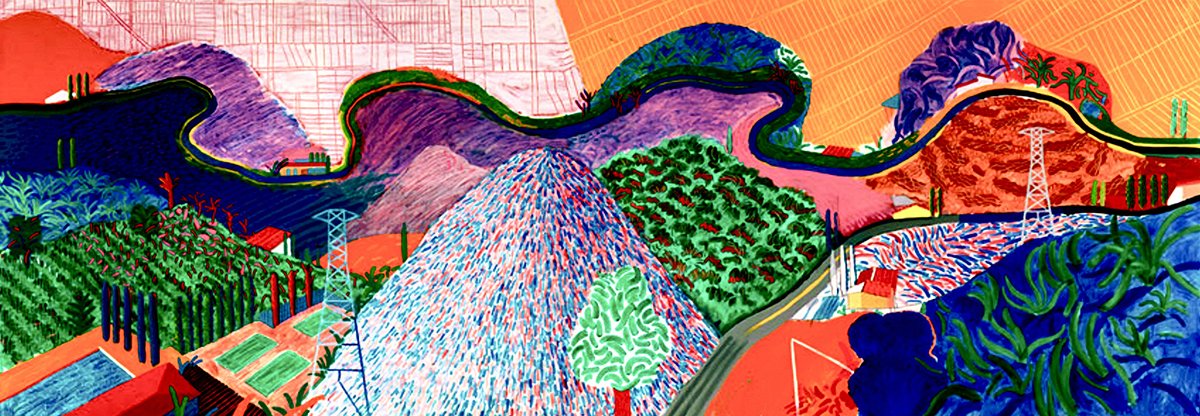 On my way home, I knew my life had changed forever. What I did not know was—so had David’s. After drawing that line, his work was never quite the same again. That one long, wiggly wave marked a seismic shift in how David viewed the world and opened a multitude of new ways of depicting it. Having just moved to a new home atop the Hollywood Hills, David no longer saw LA as a massive grid of streets and freeways. The 15-minute drive from the studio up to his house in Hollywood Hills wound its way through stunning vistas, bursting year-round with wild vegetation, fabulous flora, and soaring palm trees. His brushstrokes became freer. Now David used his arm to paint quick, bold, expressive swaths of color. The freedom was exhilarating.